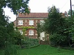 A merchants house, backing onto the river. Its nine-bay rusticated brick front has pilasters to the first floor, stone corinthian capitals and a three-storey porch, with indented pilasters decorated with lozenge-and diamond shaped stone ‘‘jewels’’.[2]