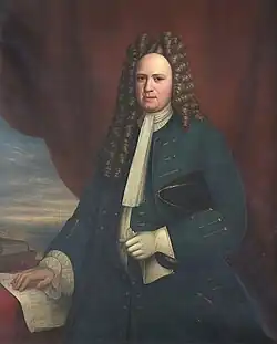 Coddington died in office on 1 November 1678 and is buried in the Coddington Cemetery (Rhode Island Historic Cemetery, Newport No. 9) on Farewell Street in Newport. His grave is marked with the original marker, as well as a taller monument erected on the 200th anniversary of the establishment of Newport.[52] His oldest son William Coddington, Jr., born of his third wife, Ann Brinley Coddington, was the governor of the colony for two terms from 1683 to 1685.[36] His son Nathaniel married Susanna Hutchinson, a daughter of Edward Hutchinson, and a granddaughter of William and Anne Hutchinson.[53] His daughter Mary married Peleg Sanford, a colonial governor from 1680 to 1683, the son of earlier governor John Sanford [53] with his second wife Bridget Hutchinson, and a grandson of William and Anne Hutchinson. His grandson William Coddington III, the son of Nathaniel, married Content Arnold, the daughter of Benedict and Mary (née Turner) Arnold, and granddaughter of Governor Benedict Arnold.[54] A portrait often ascribed to Governor Coddington actually portrays this grandson, who was very active in colonial affairs but never a governor.[55]