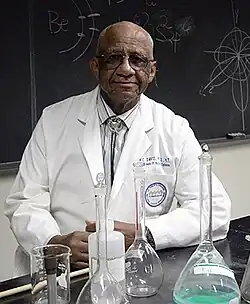 On his return, Davis completed his B.S. degree in chemistry at Talladega College, graduating in 1956. He was one of three students chosen for a George Washington Carver research fellowship to attend Tuskegee Institute in 1956.[9] At the time, it was almost impossible for a black scientist to train for a professional career in research in the United States. Even at Tuskegee, the usual career track was to train as a teacher, with a specialization in one's area of interest.[10][11] Davis was determined to do research. He worked with Clarence T. Mason of Tuskegee and studied the hydrolysis rate of compounds in jet fuel. This research enabled him to meet Wernher von Braun of the U.S. Space & Rocket Center. Davis received his Master of Science degree in organic chemistry from Tuskegee in 1958.[5]
