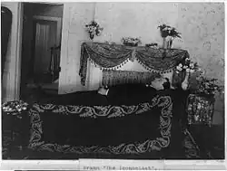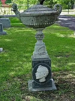 On April 1, 1898, Brann was walking alone on Waco's Fourth Street when he was shot in the back by Tom Davis, a Baylor supporter whose daughter was a student at the university.[1][4] After being shot, Brann turned, drew his pistol, and fired multiple shots at Davis, who fell, mortally wounded, in the doorway of the Jake French Cigar Store. Brann was shot through the left lung with the bullet exiting his chest. He was forced to walk to the city jail but later escorted home by friends.[8] Both Davis and Brann died the next day.[1][4] Brann is buried in Oakwood Cemetery, Waco.[1] Engraved on Brann's monument is the word "TRUTH," and beneath it is a profile of Brann with a bullet hole in it.[1][5] Brann remains a controversial figure to this day.[4]