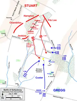 East Cavalry Field at the end of the battle on July 3. Miller's regiment, 3 PA, can be seen advancing on Fitz Lee's left flank.