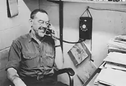 After he became an Associate in Physical Oceanography at Woods Hole Oceanographic Institution (WHOI) in Massachusetts in 1943, Bill Schevill's first work was under US Naval auspices investigating echolocation of U-boats. Indeed, he had been rejected for military service because of chronic iritis, but he joined a small group that worked with Allied submariners on monitoring the temperature of the ocean's upper levels so as to exploit it for stealth when dealing with enemy sonar.[4] As he later wrote in 1962: "During World War II many people on both sides listened to underwater sounds for military reasons. Not only the wanted sounds (those made by enemy ships), but a bewildering variety of others were heard. Most of these were ascribed to animals living in the sea, usually as 'fish noises' ... Some were ascribed to whales, in part correctly, but without identification of the kind of whale; most military listeners were not biologists, and in any case the traditional naval sonar room is woefully deficient in windows."[21] Such maritime work inspired him and, leaving palaeontology behind, led William E. Schevill to become "one of the world's most innovative whale biologists and an undisputed pioneer in the field of whale sounds,"[20] producing the first recordings of underwater whale sounds and extrapolating their purpose from these recordings. His groundbreaking work produced over fifty papers on whale phonation and thus provided the framework for “literally hundreds of scientific studies produced by other workers from the 1960s until the present day."[22] However, it is worthy of note that his wife Barbara Lawrence, by now the MCZ's Curator of Mammals, often co-wrote these documents with him.[3] However, in spite of his change in field, it is reported that Bill Schevill split his time equally between the MCZ and the WHOI - his work with the latter likely relating to Cetology as opposed to fossil studies.[4]