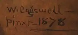 Sources vary on William F. Cogswell's date of birth, either July 15, 1819 or July 19, 1819; and his place of birth which was either in Fabius, New York, or in Sandusky, New York.[2][3][4] His gravestone uses the birth date of July 15, 1819. Cogswell was of English ancestry, with his relatives arriving to Massachusetts in 1633.[3] In the 1830s, while working in a color factory in Buffalo, New York, he taught himself to paint.