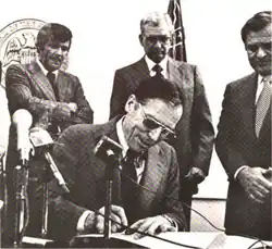 Winter assembled a staff with a mix of younger aides and several more experienced politicians. He usually met with them on weekday mornings and let them debate policy amongst themselves before he made his own decision.[151] He tended to delegate authority to his subordinates and left smaller executive matters to his appointees to determine. He kept in regular contact with appointed agency heads through a monthly breakfast, and did the same with the separately-elected officers of other state departments.[152] He supported and signed the Uniform Personnel Act into law in 1980, which extended civil service protections to 27,000 public employees and created a new state personnel board. He also issued an executive order to remove questions regarding race from state job application forms and ended the appointment of honorary colonels.[153] New legislation enabled the governor to dissolve the state Department of Motor Vehicles—which had been marred by corruption in the Finch administration—and consolidate the fifteen agencies managed by the Division of Federal and State Programs into a single office.[154] He also supported new efforts by the Department of Health to raise additional revenue by imposing additional user fees for services and adding a $5 surcharge to traffic infraction fines to create an emergency medical services fund.[155]