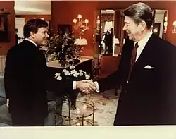 In preparation for major visits abroad and in the Oval office, as well as visits outside the United States, Martin would sometimes do the first draft of the President's weekly radio address in close coordination with Presidential chief speech writer Ben Elliott. Three of these addresses were especially important. First, Reagan's radio address in 1984 following his first meeting with a Soviet leader (Foreign Minister Gromyko) after four years in office.[14] This widely quoted radio address, highlighted in headlines on the front page of the Washington Post set the agenda and tone for the subsequent meeting with Soviet leader Gorbachev one year later. Reagan recognized Martin's role in its drafting in the following letter.[2] Second, Martin prepared a radio address describing the G-7 Economic Meeting chaired by Margaret Thatcher in 1984.[2] And third, he prepared a radio address in 1983 describing the President's visit to Japan and Korea.[2]