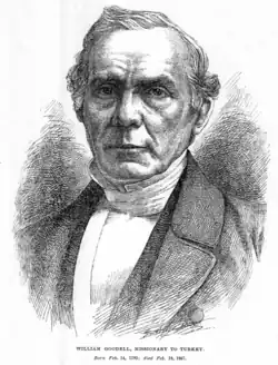 William Goodell (1792–1867) was an American missionary. He was born at Templeton, Mass., educated at Phillips Academy (Andover), Dartmouth College, and Andover Theological Seminary. He was accepted as a missionary by the American Board and at the close of 1822 sailed for Malta and thence the next year went to Beirut, where he aided in establishing the station which became the center of the Syrian mission. In 1828, on account of threatened war between England and Turkey, the missionaries moved to Malta, where Goodell worked in the preparation and printing of books for the mission, until the defeat of the Ottoman fleet at Navarino in 1831, when the way to Constantinople was open and he commenced the Armeno-Turkish mission. During his missionary life, he and his devoted wife endured many trials and perils and were compelled to move their residence 33 times in 29 years. One of his main works was the translation of the Bible into Armeno-Turkish (Turkish written in Armenian letters), spending twenty years in the task and its revision. In 1865, after 43 years, he returned to the United States and died in Philadelphia on February 18, 1867, at the residence of his son, Dr. William Goodell. His son-in-law Edward Dorr Griffin Prime published his memoirs in 1876.