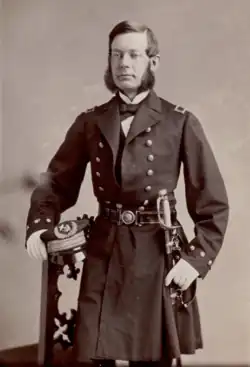 During the U.S. Civil War, Saltonstall commanded in succession two gunboats in the Federal Navy and rendered distinguished service.[4] He "rose from the position of supercargo to master" and was appointed acting lieutenant of the Minnesota.[1] During the blockade off of the Carolinas especially, he won commendation for "gallant conduct" while commander of a gunboat,[2] and in the Little Washington affair made himself known as a brave officer.[5] He left the Navy as Acting Volunteer Lieutenant Commander.[6] He later became a Companion of the Massachusetts Commandery of the Military Order of the Loyal Legion of the United States.