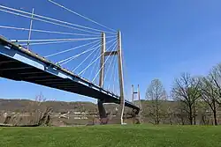 The William H. Harsha Bridge is a cable-stayed bridge carrying U.S. Route 68 that connects Maysville, Kentucky, and Aberdeen, Ohio, over the Ohio River. It is named for William Harsha, who represented the Ohio portion of the area in the United States House of Representatives. Construction on the bridge started in 1997 and it opened in 2000. The bridge has a main span of 1,050 feet (320 meters) and a total span of 2,100 feet (640 m).[2] The Simon Kenton Bridge, a suspension bridge built in 1932, is located nearby.