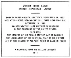 Hatch died of Bright's disease near Hannibal, Missouri, on December 23, 1896,[1][2][3] and was interred in Mount Olivet Cemetery.[4]