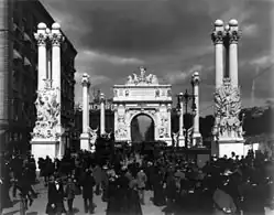 Rau complemented his landscape and travel photographs with event photographs. Notable events he covered included the Spanish–American War in 1898, the Klondike Gold Rush in the late 1890s, the funeral of President William McKinley in 1901, the eruption of Mount Pelée in 1902, the funeral of Admiral William T. Sampson in 1902, the America's Cup race of 1903, the Great Baltimore Fire of February 7, 1904,[2] the inauguration of President Theodore Roosevelt in 1905, and the arrival of the RMS Olympic in New York Harbor on June 21, 1911.[7] He was also the official photographer for the St. Louis World's Fair in 1904 and the Lewis and Clark Centennial Exposition in Portland the following year.[1]