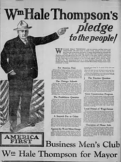 31. ^ a b c d e f g h Nichols, Jeff (2 June 2017). "Chicago mayor Big Bill Thompson used 'America First' decades before Trump". Chicago Reader. Retrieved 10 January 2022.