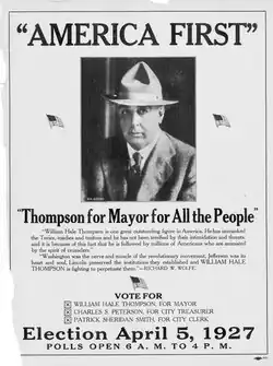 Thompson pledged that his "America First" slate would see such strong victories that, "the king of England will find out for the first time he is damned unpopular".[31] Thompson's campaign anthem was titled "America First, Last and Always". Thompson promised to lend support to the creation of so-called "America First Associations" across the United States.[72] Jeff Nichols of the Chicago Reader would retrospectively observe in 2017 of Thompson's "America First" movement that,
