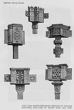 Rain-hoppers, cast in lead by Henry Hope & Sons, of Smethwick, from designs by William Haywood