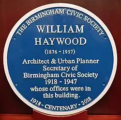 On 2 November 2018, the Birmingham Civic Society unveiled a blue plaque to Haywood, which is located on the site of his practice offices at 37 Bennett's Hill, Birmingham. At that time the chairman of the society announced the inauguration of the William Haywood Prize for exceptional architectural or planning contribution to the City of Birmingham.
