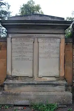 He is buried with his wife Williamina and other members of his family against the north wall of the Grange Cemetery in Edinburgh.