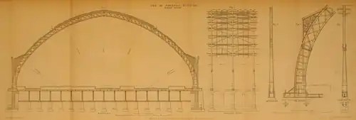 Between 1862 and 1869, Barlow was consultant engineer for the Midland Railway's southern extension from Bedford to London, including the layout of the London terminus station at St Pancras on Euston Road. To deal with the sloping site and the need to cross the Regent's Canal a short distance to the north, the platforms were constructed on a raised structure supported on cast iron columns and girders. Under this structure, storage was laid out for beer from the breweries at Burton upon Trent.[5] With assistance from Rowland Mason Ordish,[6] Barlow also designed the arched, cast iron station canopy which spans 240 feet (73 m) across the platforms without intermediate support – then the widest of its kind in the world. It was designed as a cost-effective and efficient means of avoiding the need for additional solid structure in the lower level.[7] George Gilbert Scott designed the hotel in front of the train shed.[6]