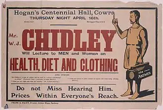 On Thursday evening, 16 April 1914, Chidley delivered a lecture "to a very small audience" in Hogan's Centennial Hall at Cowra, in the Central West region of New South Wales. The local newspaper attributed the small attendance to unfavourable weather conditions and "the lack of publicity given to the lecture". Chidley had earlier "caused a sensation when he appeared in the streets in his rather meagre attire".[44]