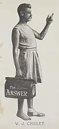 William James Chidley (c. 1860 – 21 December 1916) was an Australian sex reformer and eccentric who consistently advocated his unconventional theories on sex, diet and clothing. His book The Answer was first published in 1911 in Melbourne, explaining in detail the author's unconventional theories. After The Answer was declared an obscene publication in Victoria, Chidley moved to Sydney where he continued to address crowds and sell copies of his book, dressed in his characteristic knee-length tunic. In the following years he was the subject of frequent arrests for selling an obscene publication and using indecent language, and on several occasions declared to be insane and incarcerated in asylums. He died at the Callan Park asylum in December 1916.