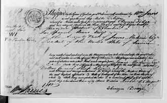 In 1808, he married Mary Pepperell Sparhawk of Boston, a fellow descendant of Sir William Pepperell of Massachusetts. (Jarvis' wife was the niece of his mother, the former Mary Pepperell Sparhawk Jarvis.)[12] Mary Sparhawk bore him two children before her death in 1811. Six years later, he married Anna Bailey Bartlett, the daughter of Bailey Bartlett of Haverhill, Massachusetts, a member of the convention that drafted the U.S. Constitution, a Presidential Elector, a High Sheriff of Essex County (to which post he was appointed by John Hancock) as well as State Senator and County Treasurer.[13] William Jarvis and the former Anna Bartlett had ten children.