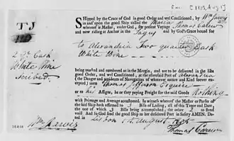 Bill of lading for wine sent from U.S. Consul Jarvis to Thomas Jefferson, 1805