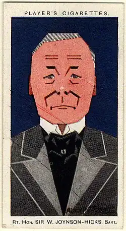 Joynson-Hicks gained personal notoriety in the immediate aftermath of this election for an address to his Jewish hosts at a dinner given by the Maccabean Society, during which he said "he had beaten them all thoroughly and soundly and was no longer their servant."[12] Subsequent allegations that he was personally anti-Semitic formed an important strand of the authoritarian streak that many, including recent scholars David Cesarani and Geoffrey Alderman, detected in his speeches and behaviour. Cesarani cautioned that "although he may have been nicknamed 'Mussolini Minor', Jix was no fascist."[13] Other work has disputed the notion that Joynson-Hicks was an anti-Semite, most notably a major article by W. D. Rubinstein which asserted that as Home Secretary Joynson-Hicks would later allow more Jews to be naturalised than any other holder of that office.[14] Whether or not it was justified, the notion that Joynson-Hicks was an anti-Semite played a large part in his portrayal as a narrow-minded and intolerant man, most obviously in the work of Ronald Blythe.[15]