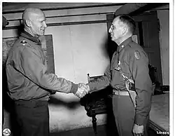 Lieut. Gen. William H. Simpson (commanding general, Eighth Army) congratulates Harrison upon his decoration with the Army Distinguished Service Medal for his previous service with the War Plans Division, War Department General Staff. Germany, February 1945.