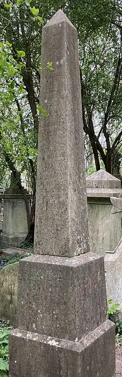 He died impoverished on 8 August 1877 and was buried on the western side of Highgate Cemetery. His grave is now a grade II listed monument.[7]