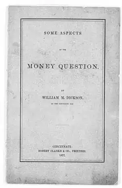 He had suffered from "nervous prostration" after the war, which had caused Dickson to leave politics and the law at age 39. He was a semi-invalid for 23 years, during which he "despaired at the corruption and machine politics which increasingly characterized his party during the Gilded Age of late nineteenth century America."[7] He wrote about black suffrage, reconstruction, civil service reform, and other topics[7] often under the initials W.M.D.[1] Dickson wrote a memoir entitled Lincoln at Cincinnati.[5]