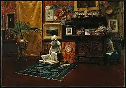 In New York City, however, Chase became known for his flamboyance, especially in his dress, his manners, and most of all in his studio. At Tenth Street, Chase had moved into Albert Bierstadt's old studio and had decorated it as an extension of his own art. Chase filled the studio with lavish furniture, decorative objects, stuffed birds, oriental carpets, and exotic musical instruments. Chase's studio attracted numerous artists and cultural figures in New York City during the late 19th century. By 1895, the cost of maintaining the studio, in addition to his other residences, forced Chase to close it and auction the contents.