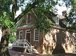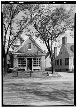 The Prentis Store is the oldest surviving commercial structure in Williamsburg.[5] Although the enterprise originated with Archibald Blair, it was William Prentis that constructed the brick building which has stood tall on the corner of Duke of Gloucester and Colonial Streets since 1739. Throughout the span of 200 plus years the building housed a variety of businesses, right into the early twentieth century. Now part of Colonial Williamsburg, the initial restoration erased all evidence of previous uses. A further restoration in 1972 returned the building entrance to the original above grade height.[6]