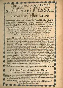 - ^ William Prynne (1655), The First and Second Part of a Seasonable, Legal, and Historicall Vindication, and Chronological Collection of the Good, Old, Fundamentall Liberties, Franchises, Rights, Laws of All English Freemen Their Best Inheritance, Birthright, Security, against All Arbitrary Tyranny, and Ægyptian Burdens) and of Their Strenuous Defence in All Former Ages; of Late Years Most Dangerously Undermined, and almost Totally Subverted, under the Specious Disguise of Their Defence and Future Establishment, upon a Sure Basis, by Their Pretended, Greatest, Propugners. Wherein is, Irrefragably Evinced by Parliamentary Records, Proofs, Presidents, that We Have such Fundamentall Liberties, Franchises, Rights, Laws. That to Attempt or Effect the Subversion of All or Any of Them, (or of Our Fundamentall Government) by Fraud or Force, is High Treason. [...] Collected, Recommended to the Whole English Nation, as the Best Legacy He Can Leave Them (2nd corr. & much enl. ed.), London: Printed for the author, and are to be sold by Edward Thomas in Green Arbour, OCLC 15871789.