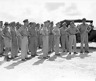 Problems like this underlined the value of having high-ranking officers on hand to deal with local commanders to make decisions on the spot if necessary. In drawing up an organization for command of the Manhattan Project's operations, Groves and Purnell agreed that Purnell should to be present on Tinian as both the representative of the Military Policy Committee and the personal representative of Admiral King. He was joined by Brigadier General Thomas F. Farrell, the Manhattan Project's Deputy for Operations, and the two shared responsibility for coordinating the Manhattan Project's activities with the senior army and navy commanders in the Pacific.[15] Along with Captain William S. Parsons, the director of Project Alberta, they formed what became informally known as the "Tinian Joint Chiefs".[16]
