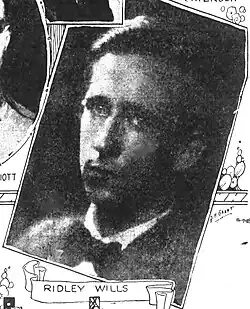 His father was Asa Mann Wills, who gave his son the identical name of the son's uncle, William Ridley Wills, who was one of the founders of the National Life and Accident Insurance Company in Nashville in 1902.[5] His mother was Della Belle Womack. While a student at Vanderbilt University, Wills and his younger cousin Jesse Ely Wills (father of Ridley Wills II) were both members of the Fugitives literary movement.[6] After the returning from France, William Ridley Wills married Louella Wilson and they had 5 children: Andrew, William, David, Louella, and Thaddeus. They divorced in 1942 in Duval, Florida.