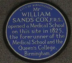 He founded Birmingham's first medical school in 1825[2] as a residential Anglican-based college in Temple Row, where a blue plaque commemorates him on the House of Fraser department store, and in Brittle Street (now obliterated by Snow Hill station). Cox went on to found the Queen's Hospital in Bath Row (Drury & Bateman, opened 1841) as a practical resource for his medical students.