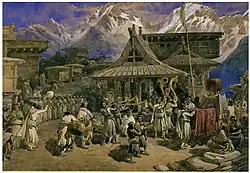 In 1857, he was sent to India to sketch scenes relating to the recent Sepoy Revolt, which is also described as the Indian Rebellion of 1857.[4] The idea was to produce an illustrated publication similar to the Crimean portfolio, and Simpson had discussed the possibility with Mr. Day. The artist arrived at Calcutta on 29 October 1859, and travelled in Punjab, Sutlej, Bengal, Lucknow and Cawnpore, central India, the Himalayas, Kashmir and Madras. In February, 1862, he left Bombay and arrived in London only to find that Day and Son could not afford to produce a portfolio. Nevertheless, a large volume of coloured lithographs was published under the title India Ancient and Modern. He was commissioned by Day & Son to visit these parts of India and record the places affected by the momentous events of the 'Mutiny' of 1857. Before leaving, he spent 'a considerable time in the library of India House, then in Leadenhall Street, looking over books about India, such as Daniels', to see what had been already done, and to get hints as to places I ought to visit'.[2] The set of lithographs produced, based on his watercolours, was intended to rival David Roberts' The Holy Land in scope. However, the project never came to fruition, following the financial collapse of Day & Son, due to the rise of wood engraving. By 1866, Simpson had delivered 250 watercolours to Day & Son and these were subsequently sold off as bankrupt stock.[3] Only 50 had been prepared as chromolithographs, and were published in 1867 as India Ancient and Modern. A series of illustrations of the country and people of India and adjacent territories. For Simpson this was little consolation: 'So the great work on India, on which I had bestowed so much time and labour, never came into existence...'.[2]