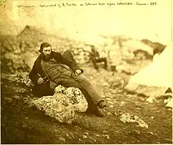 Simpson arrived off the Crimean peninsula on 15 November 1854 and could hear distant firing. While he had missed the early battles, he was able to record the events before Sevastopol. He made numerous acquaintances who helped him with details for his pictures, but he was also struck by the plight of the common soldiers, "miserable looking beings...covered with mud, dirt, and rags," he wrote. He socialised with many officers, including Lord Raglan and Captain Peel; he also met Roger Fenton who took his photograph. In May 1855, Simpson accompanied Raglan on the expedition to Kertch which was captured on the 24th, but was back in time to observe the first Siege of Sevastopol in June. On the night of the 17th, he crawled out of a trench to view the attack. He wrote, "It was a wild orchestra of sound, never to be forgotten." He was still at the front when the city surrendered, and he quit the Crimea in the autumn of 1855.[3]