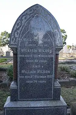 Isabella Williams died in 1882.[38] Wilson died on 8 November 1897. He was buried at Linwood Cemetery.[39][40]