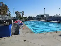 The William Woollett Jr. Aquatics Center is an aquatics venue located in Irvine, California, United States. The City of Irvine operates year-round municipal programs in aquatic facility. The center provides a venue for local, regional and national competitive events and features two 50 meter pools and a 25-yard instruction pool. Aquatics activities include a combination of instructional, educational, recreational and competitive programs offered by the City and a number of local nonprofit aquatic organizations. During the 1984 Summer Olympics, it hosted the swimming portion of the modern pentathlon event. It has since hosted the 2010 Pan Pacific Swimming Championships, the United States Swimming National Championships in 2005, 2006, 2010, 2014, 2018, and 2022, and the 2015 USA Water Polo National Junior Olympics. The facility, originally named the Heritage Park Aquatics Center, was renamed after the City of Irvine's first City Manager and rebuilt beginning in 2003.