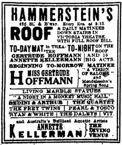 Performers enjoyed playing the Victoria. Buster Keaton thought it was the greatest of the vaudeville houses.[12] Hammerstein asked performers back many times if he liked them, as with the British comedian Harry Tate.[4] In June 1905 Willie Hammerstein signed up Will Rogers to perform in the Victoria for afternoon matinees and in the Paradise Roof Garden in the evenings.[5] The young Mae West played eleven one-week engagements in 1912 and 1913, a good fit with the audience through her suggestion of notoriety.[9] Hammerstein often booked acts from Europe, who sometimes made up half the show.[14] He introduced the dancers Gertrude Hoffmann and Constance Stewart-Richardson to the vaudeville stage.[3] A review in the New York Dramatic Mirror of August 12, 1905, gives a sense of the shows: