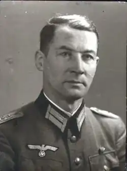 From December 1939, he was stationed in Węgrów, where he remained until his battalion was moved another 30 km away to Jadów at the end of May 1940. He was finally transferred to Warsaw in July 1940, where he spent the rest of the war, for the most part, attached to Wachbataillon (guard battalion) 660, part of the Wach-Regiment Warschau (Warsaw Guard Regiment) in which he served as a staff officer and as the battalion sports officer.[14] As an intelligence officer,[15] he reported to the Stabsabteilung Ic (Feindaufklärung und Abwehr) in the Oberkommando der Wehrmacht.[16] In late August and early September 1940, he acted as a liaison officer for the Wien-Film crew commissioned by the Reich Ministry of Public Enlightenment and Propaganda and helped it choose set locations across the General Government for the making of the anti-Polish propaganda film Homecoming (1941).[17]