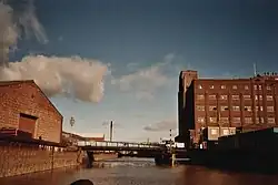 At the southern edge of the area a swing bridge road crossing the River Hull, Sculcoates Bridge, was opened in 1875.[15][16][map 6] The bridge consisted of a fixed span on the east bank of 27 feet (8.2 m) and a counterbalanced swing span made of 113 feet (34 m) girders, with a river span of 56 feet (17 m). The design was by J. Fox district engineer, the bridge was constructed by the Bridge and Roofing Co. of Darlaston. Total cost was £18,000.[17] In 1885 the Hull and Barnsley Railway opened, with a branch to the new Alexandra Dock passing on an embankment through the northern extremity of the Wilmington area, crossing Cleveland Street at height;[map 7] a swing bridge was built over the River Hull.[map 8] An embanked chord was built to connect the line to the Victoria Dock Branch Line, adding a third railway bridge over Cleveland Street.[map 9][18][n 2]