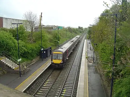 Wilnecote railway station is a railway station serving the town of Fazeley and suburb of Wilnecote in Staffordshire, England. It is 1.5 miles (2 km) south of Tamworth town centre.[2] The station is situated beneath a bridge which carries the former A5 Watling Street.