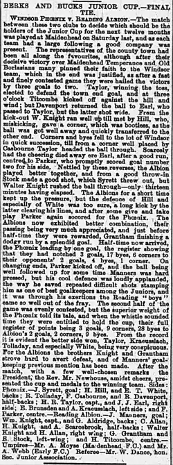 1887–88 Berks and Bucks Junior Cup final, Windsor Phoenix 3–2 Reading Albion, Bucks Free Press, 16 March 1888