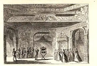 A rare etching of the interior of the theatre at this time depicts a production by Laura Keene in her theatre; From the point of view of the stage, it depicts what is probably the production of a classical text, with two figures in historical costumes standing downstage close to the footlights.[13] This etching, from the actors' point of view, gives a rare glimpse into theatrical production on the American stage in the pre-Civil War era.