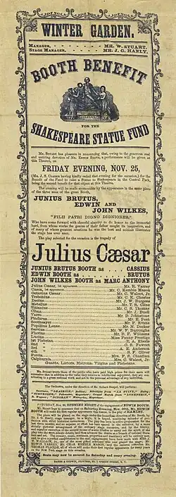 The city was saved, as was The Winter Garden Theatre. The production of Julius Caesar proceeded. The production was the first – and only – time that the three sons of one of America's great tragedians, Junius Brutus Booth, performed together on the same stage. The production raised $3,500 for the building of the statue of Shakespeare in Central Park, which stands there today.[28]