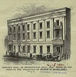 Tripler Hall also was used for other large gatherings. In December 1850 it was the site of an important ceremonial meeting of the Freemasons of New York City, which was attended by thousands of men. It was described as "the event was regarded and still is regarded [1899] as a landmark in the history of Freemasonry in the history of New York."[9]