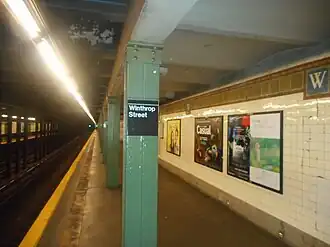 22. ^ Cox, Jeremiah (July 22, 2009). "A close up of 1950s blocky Winthrop St text on the extreme southern end of the Manhattan-bound platform". subwaynut.com. Retrieved February 18, 2018.