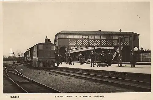 A new brick engine shed was also provided, with a 42 ft turntable, on a goods spur; initially it had only a single road to accommodate a trio of engines, but a second was added in 1893 to handle the station's growing traffic in perishables. This went out of use in the 1910s, with only the turntable remaining by 1925 when the London and North Eastern Railway had taken over responsibility for the line. Activities at Wisbech was by that time principally concerned with the tramway.[10] Tramway services departed from a specially-low platform at Wisbech.[11]