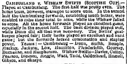 The club reached the same stage again in 1885–86 - this time made up of 19 clubs - beating Albion Rovers 5–0 in a replay en route to a tie with Cambuslang;[7] the Rovers' protest against the Swifts' rough play and rough pitch markings was dismissed.[8] At Cambuslang, although the Swifts kept the score down to 1–0 at half-time, Cambuslang scored eight further goals without reply in the second half.
