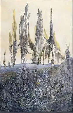 The further development in the work of Paalen continues to follow up the idea of a biological-evolutionary-physical-cosmological continuum, in which the human organism can evolve and unfold. Prelude for a series of oil-Fumages within the Surrealist group gave the discreet affair of Pablo Picasso with Alice Rahon which had led to an abortion.[7] The deep crisis of the couple and Paalen's first grave attack of depression led to his first important Surrealist masterpiece, Pays interdit ("Forbidden Land"), an apocalyptic landscape dominated by a female goddess and fallen, meteorite-like planets. Paalen had designed his personal model of the permeable poetic soul in the form of a cryptic, abyssal landscape, pervaded by a mixture of feminine mystique and romantic ‘shock’ imagery reminiscent of pre-Celtic faerie mysteries and their cosmic allusions, as these are known in the lyrical tradition of Brittany. This was also the first painting, into which he artfully integrated his fumage, in the extremely fine, crystalline execution of the lower section. In 1937 he realized many paintings in this style, including Fata Alaska.